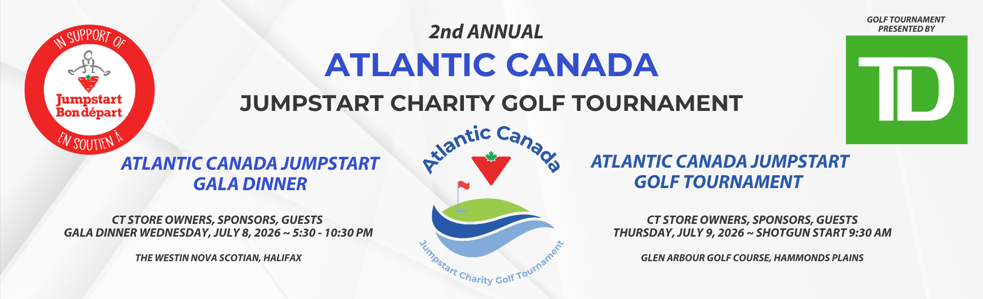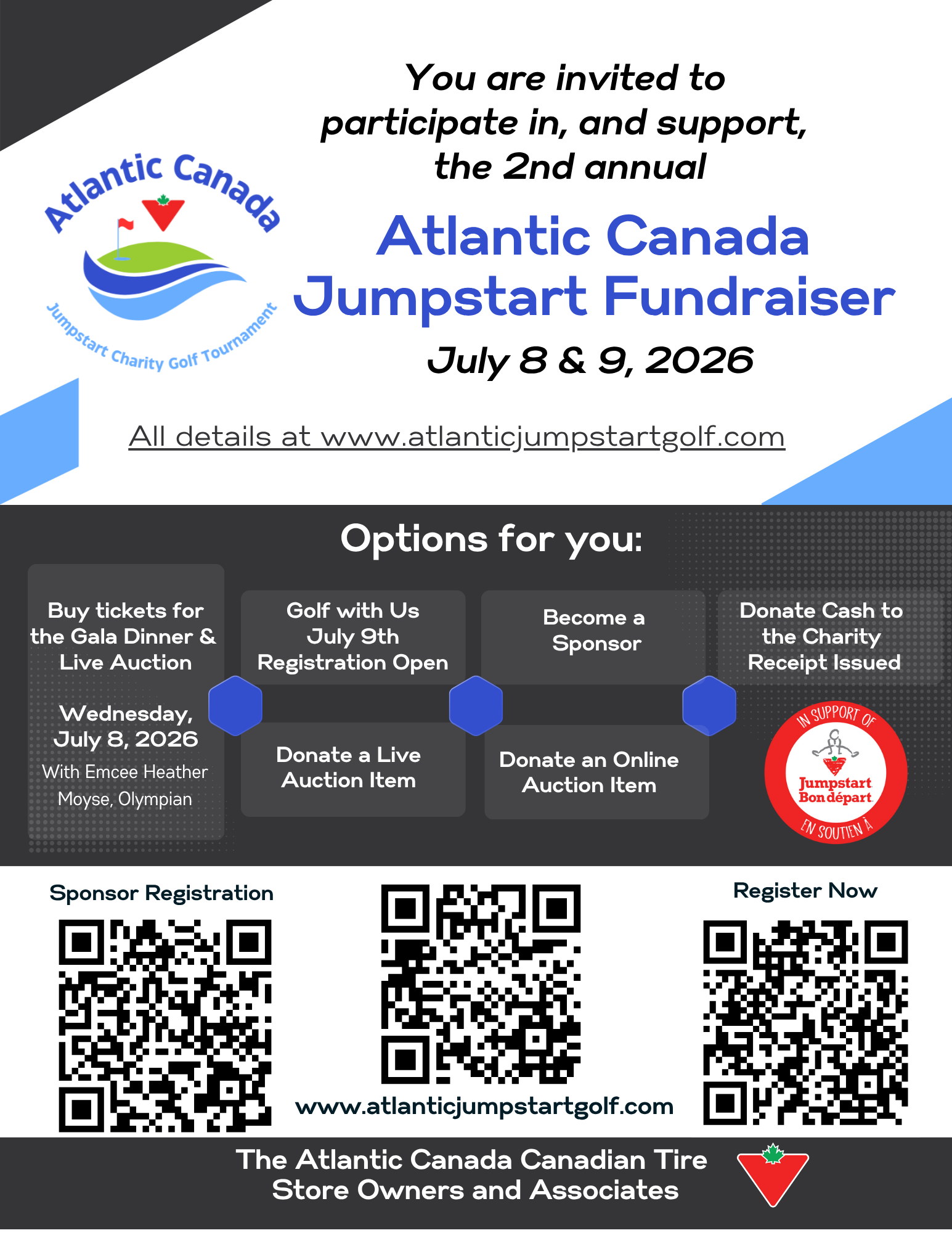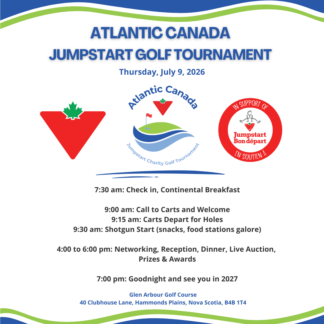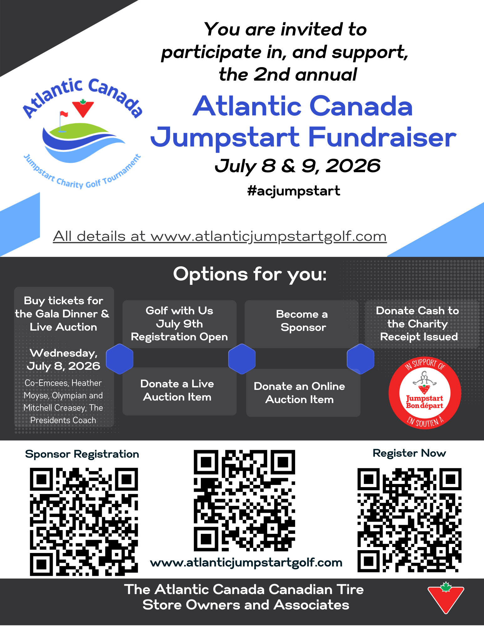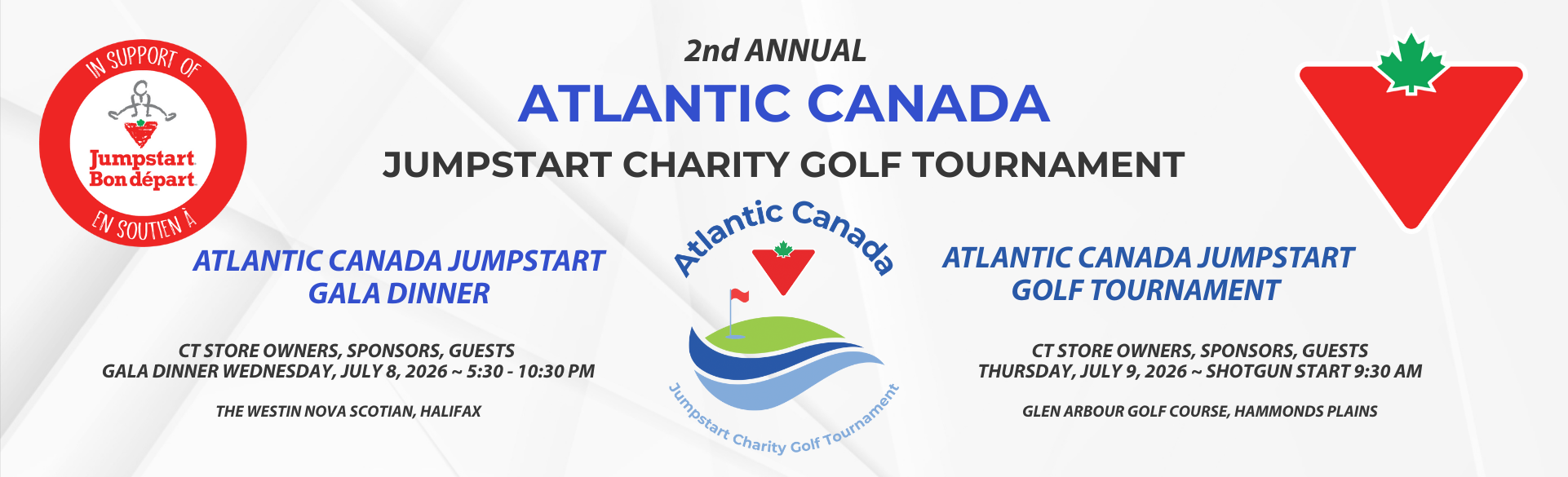 WELCOME BACK sponsors, golfers, donors, and volunteers, to the 2nd annual Atlantic Jumpstart Golf Tournament, supported by, and attended by, 45+ Atlantic Canadian Tire Store owners, management, and staff. With all funds raised supporting Atlantic Canada Jumpstart Chapters.