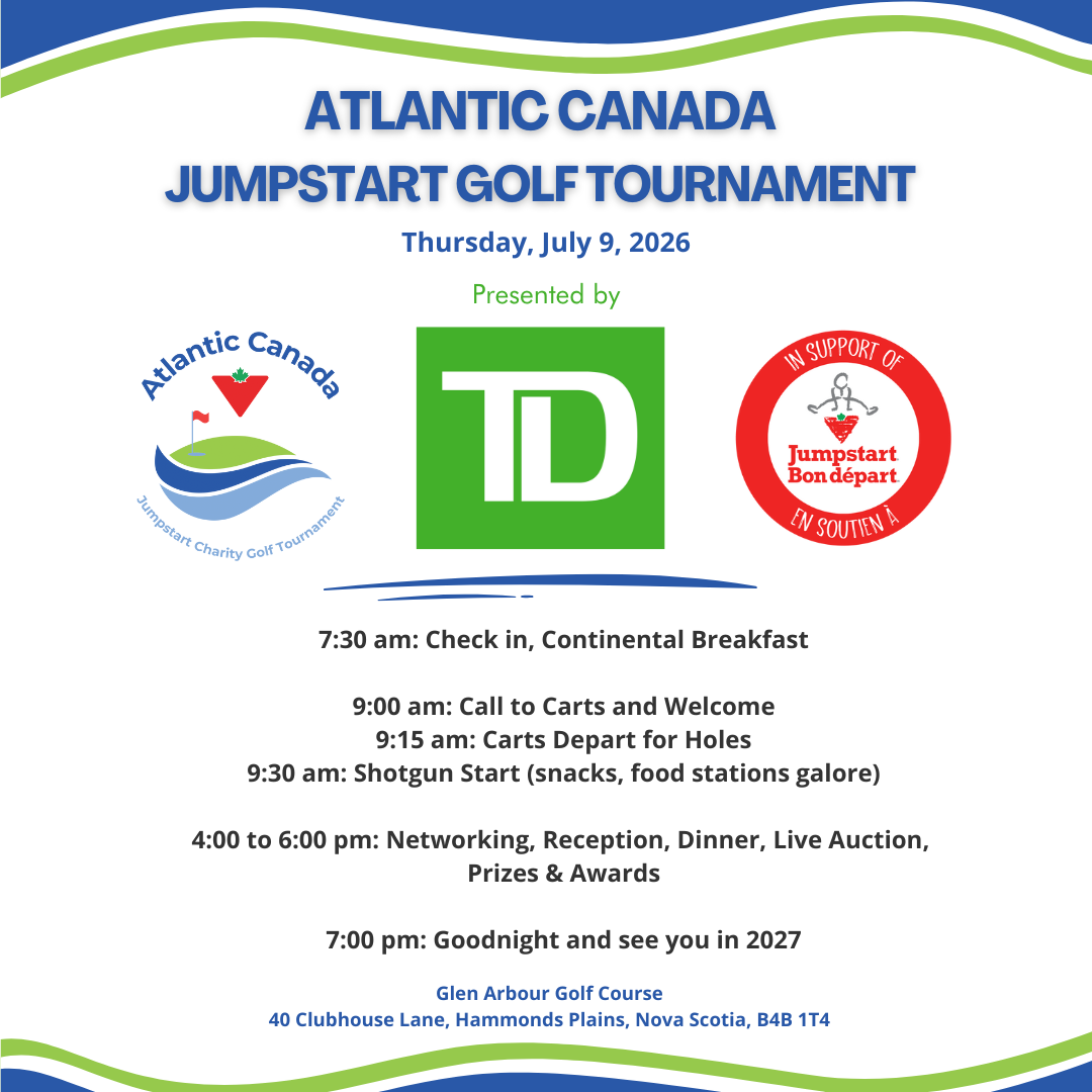 We are back at Glen Arbour Golf Course, Hammonds Plains, NS again for the 2nd annual Atlantic Canada Jumpstart Golf Tournament! Playing in teams of six (6) golfers we will take to the links on July 9, 2026. A fast paced and fun sixsome scramble format brings in low team scores. Six tee shots! Six chances of making that eagle putt. The drama. The laughs. The groans. All included.